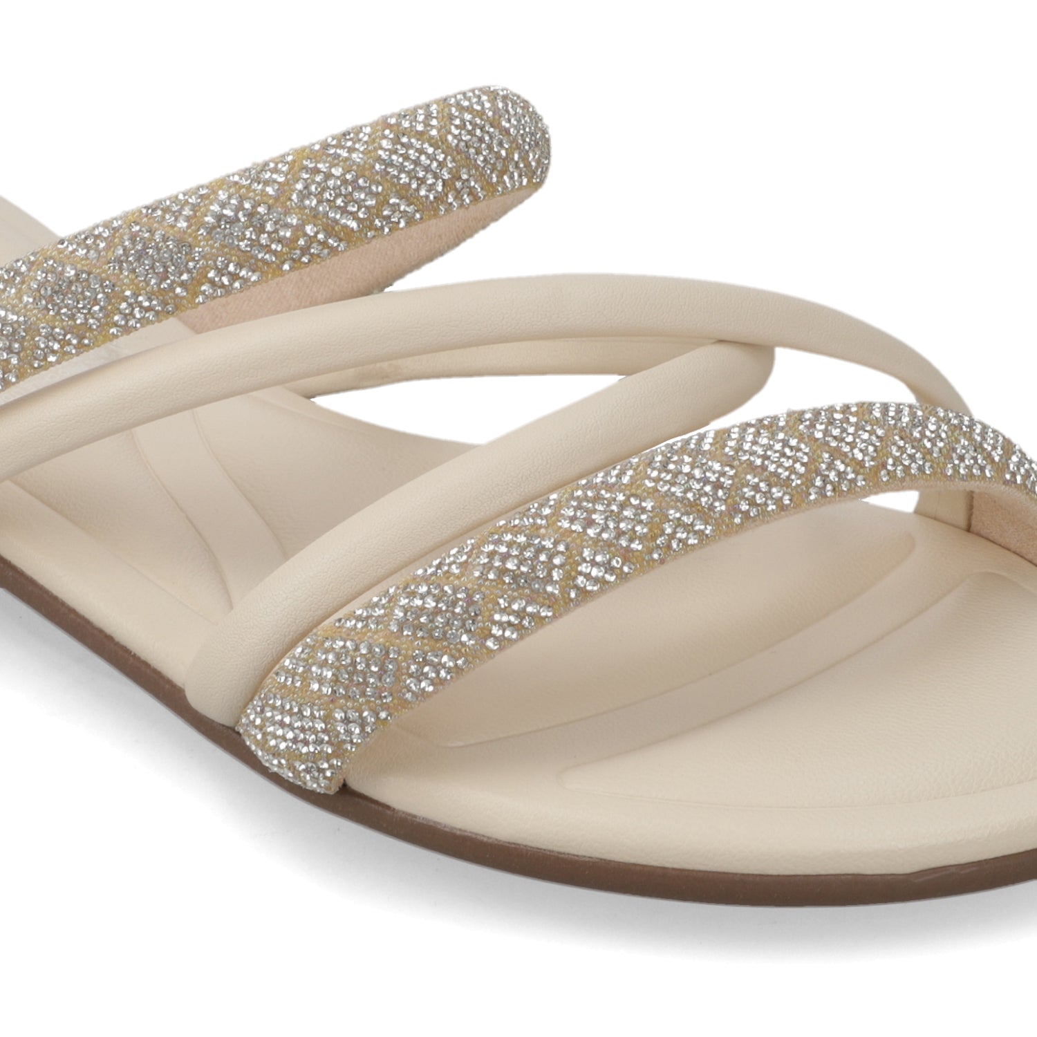Ligera, fresca y con un toque de brillo. Esta sandalia plana en tono crema es perfecta para acompañarte en días soleados, combinando comodidad y estilo sin esfuerzo. Sus tiras delicadas con destellos luminosos elevan cualquier look, dándole ese aire femenino y moderno que te hará destacar en cada ocasión. Ideal para usar de día o de noche, siempre con la elegancia sutil que te caracteriza.